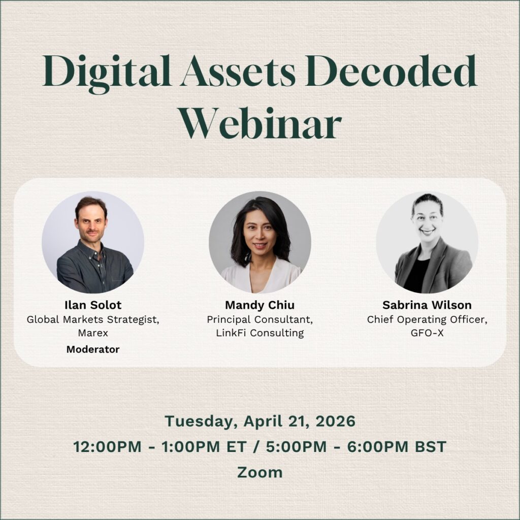 Join us for our Digital Assets Decoded Webinar Crypto and digital assets continue to evolve at speed – from shifting market dynamics to growing institutional adoption and real‑world use cases. Join us for an interactive panel featuring Mandy Chiu, Sabrina Wilson, and moderated by Ilan Solot, as they cut through the noise and focus […]